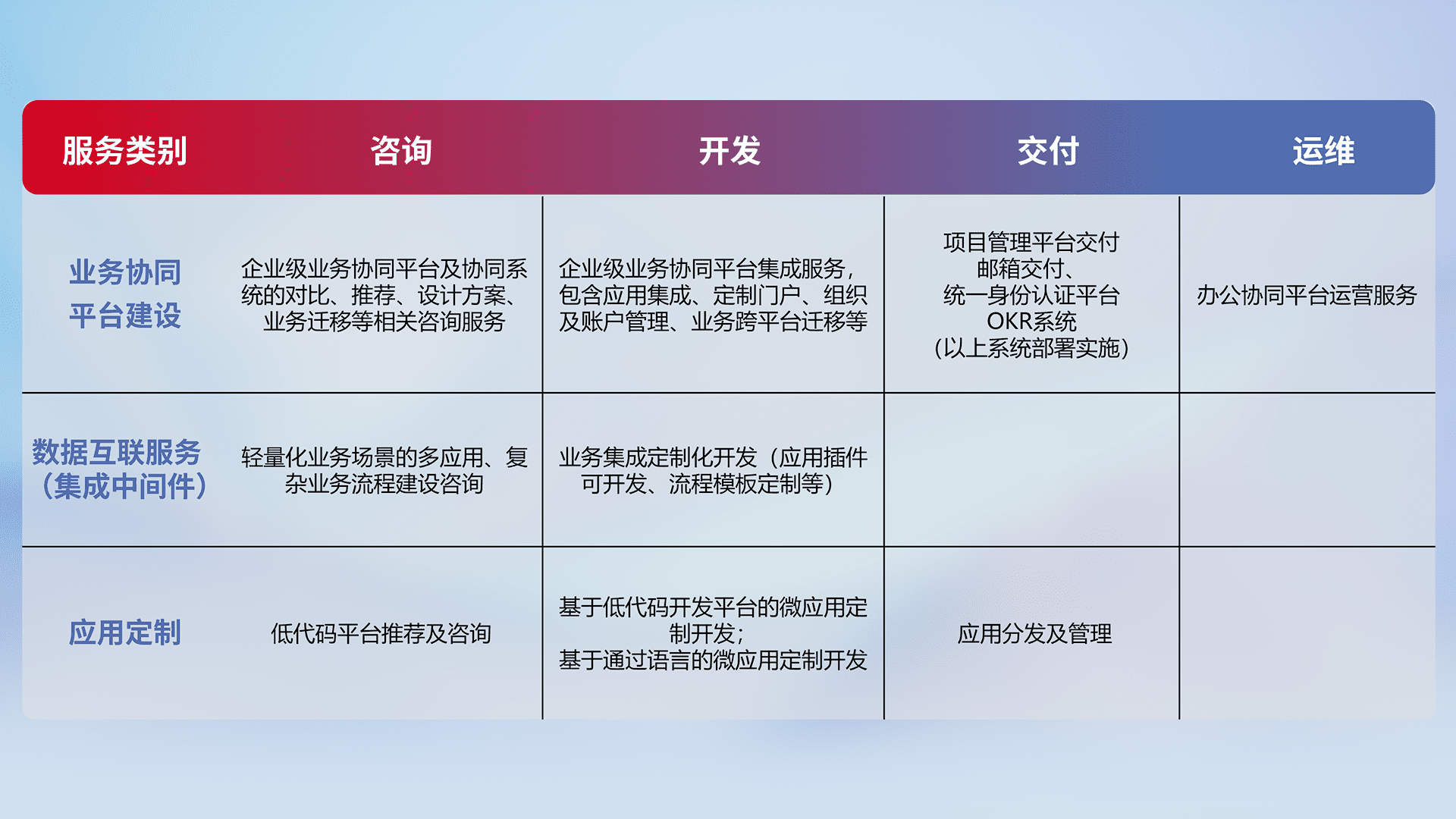 针对钉钉、、企微、、、、IDaas等平台级产品提供产品的规划、、、、方案、、、、交付、、、、定制化开发等服务,,实现如统一协同办公、、智能客户服务、、、混合会议管理、、、智能数据查询、、等业务场景,,,实现数字化转型。。。。